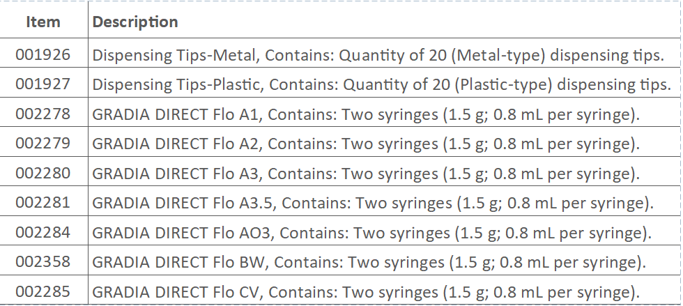 GRADIA DIRECT Flo is a light-cured, highly flowable composite. Designed to be used in combination with GRADIA DIRECT, its physical properties, flow characteristics and direct application make this material ideal as a liner under composite restorations. GRADIA DIRECT Flo’s non-sticky formula shapes perfectly to cavity wall, making it easy to handle.