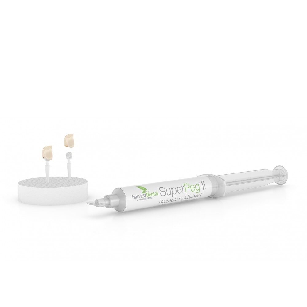 SuperPeg II is a second generation, advanced high-heat resistant refractory material used for custom ceramic firing stabilising. The material can be easily shaped and used with any type of porcelain. Available for a variety of uses in the laboratory, the material is stable up to 1300°C (2375°F) and eliminates firing distortion and contamination. SuperPeg II offers a freeze stable solution for hassle free shipping and extended shelf life for added value. Simply inject Super Peg II into your crown. place on a firing peg and fire. Once the firing cycle has completed, Super Peg II is simply ‘pulled out’ leaving a totally clean core – no more clean up is required!