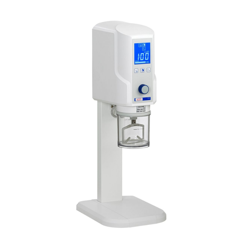 The compact Twister vacuum mixer can be employed for all conventional casting and modeling materials used in dental technology. All mixing parameters are quickly and easily input. The high performance motor and high quality vacuum pump guarantee homogenous and bubble-free mixing results for dental plasters, investments, and silicones.