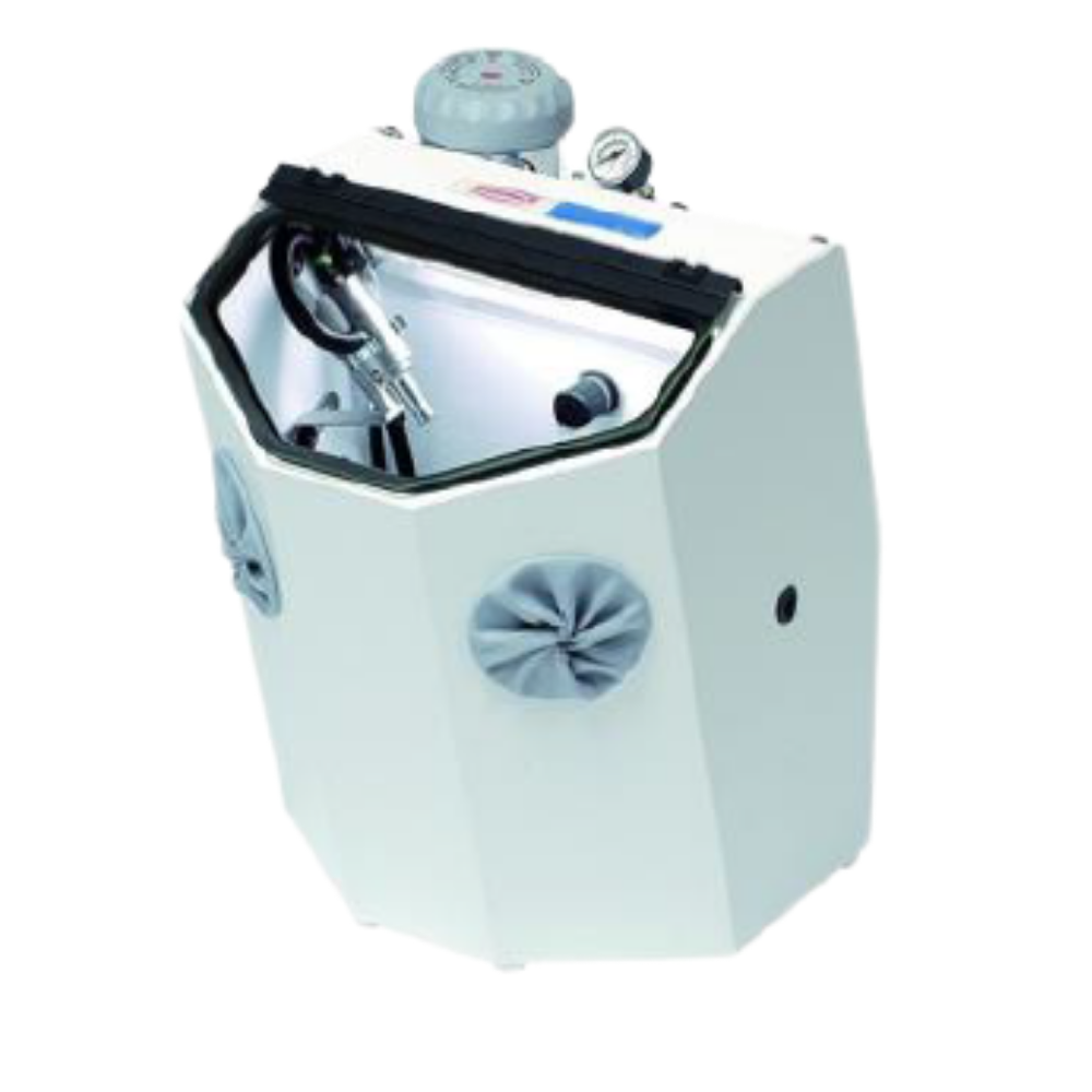 Combined recyclable blaster and fine sand blasting unit. Its compact con-struction and multipurpose function is ideal for medium-sized and small labs.